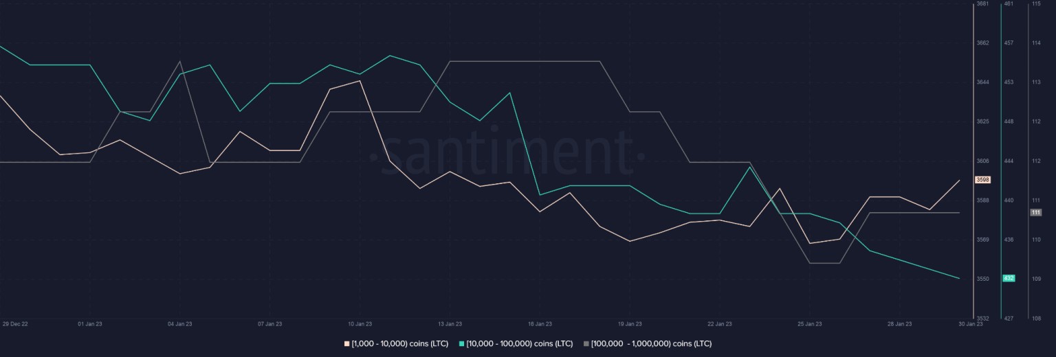 However, the holdings of small and large Litecoin whales narrated a different story. As per data provided by Santiment, the number of addresses with more than 1000 LTC coins has been on a falling slope in the last 12 days.