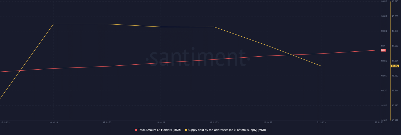 Surprisingly, despite the massive hike in MKR’s price last week, its supply held by top addresses registered a decline. Nonetheless, its total number of holders rose slightly.