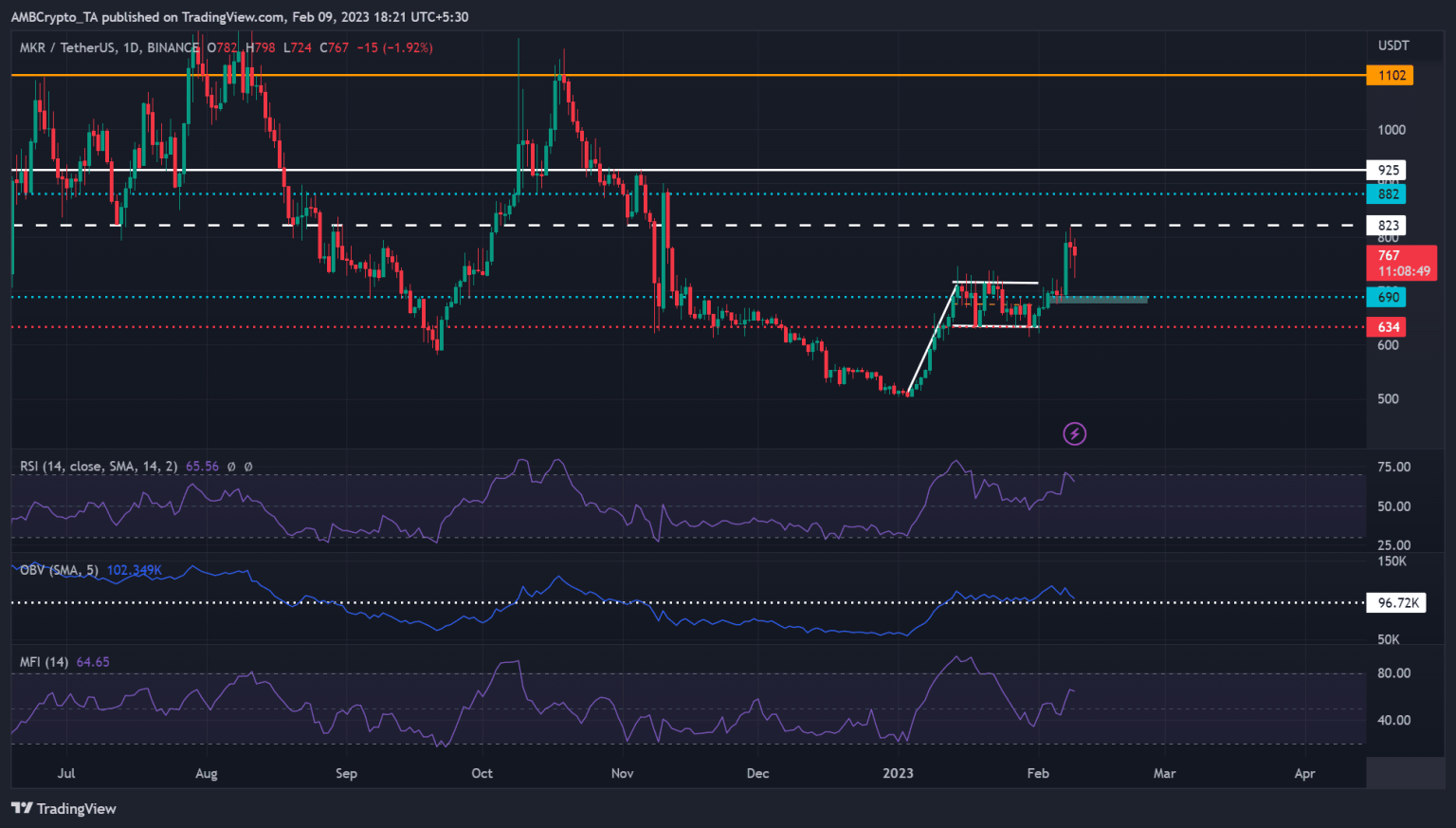 As such, MKR bulls could break above the overhead resistance level of $823 and target the November high of $925. The upswing could be accelerated if BTC breaks above the $22.75K level. At the same time, the bulls must clear the $882 hurdle to reach their target.