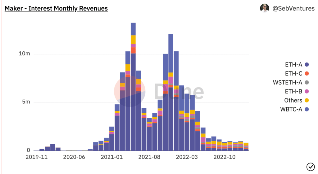 If DAI adoption increases, it could improve the revenue generated by MakerDAO. At the time of writing, the revenue generated by MakerDAO, especially through interest generated from stablecoins, was decreasing. Most of the revenue generated by the protocol depended on its investments in real-world assets (RWA).