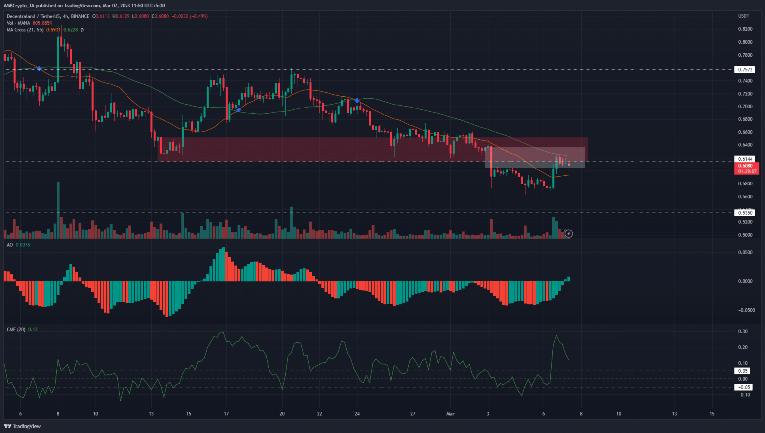 A bullish order block from 13 February was broken during this dump and is now a bearish breaker block. Highlighted in red, this box has confluence with the resistance at $0.614 and the fair value gap. The market structure on H4 was also strongly bearish as MANA formed lower highs and lower lows since 24 February.