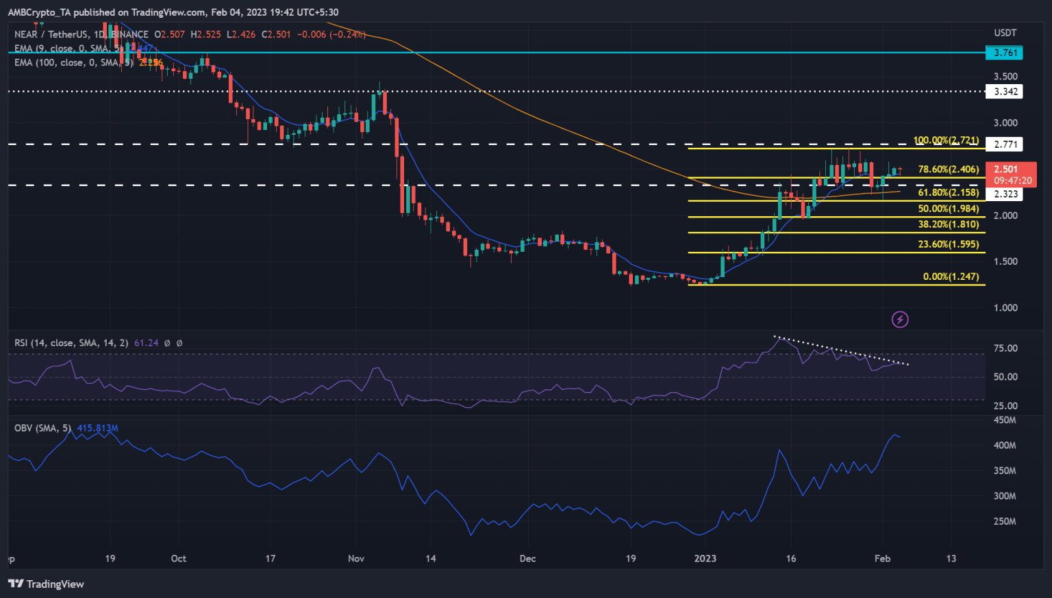 NEAR Protocol [NEAR] more than doubled in value after the January rally. It jumped from $1.247 to $2.721 but later fluctuated. At press time, NEAR’s value was $2.501 but increasingly faced a likely correction because of divergence from a technical indicator.