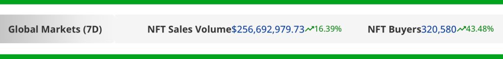 Closing out the third week of January 2023, non-fungible token (NFT) assets saw a 16.39% increase in overall sales. 320,580 buyers participated in the NFT market action this past week, an increase of 43.48% compared to the week prior. $256.69 million in NFT sales were recorded over the last seven days, with $206.06 million being Ethereum-based NFTs.