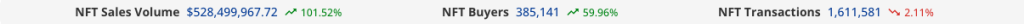 According to data from NFT aggregator CryptoSlam, NFT sales volume has increased over 101% in the past week compared to the week prior and has hit over $524 million transacted in the last seven days at the time of writing.