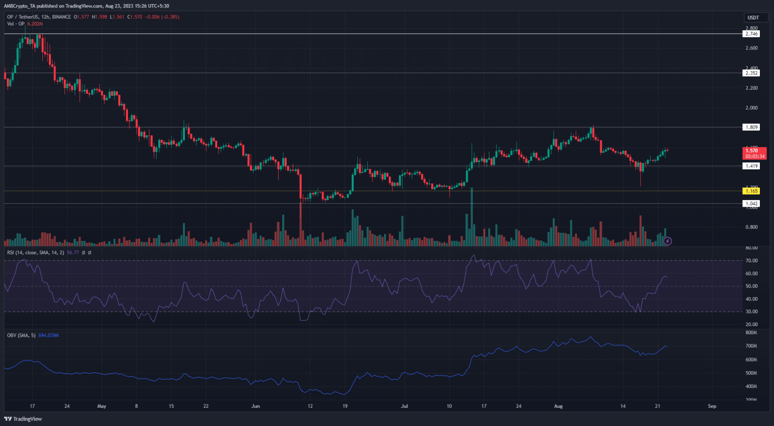 Optimism [OP] extended its ranging price movement, with prices rebounding from the range-low of $1.41. This kept Optimism firmly between the upper range of $1.80 and the lower range of $1.41, as bulls and bears continued to fight to gain the upper hand.