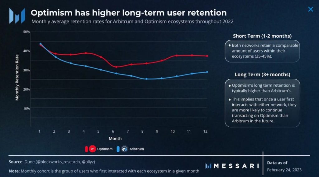 As per the report, in the short term, 35–45% of new users were retained by both Arbitrum and Optimism, although Optimism retained a larger percentage of its long-term user base. Though both the short- and long-term retention rates are valuable metrics, the latter is more important in order to understand the value of a blockchain.