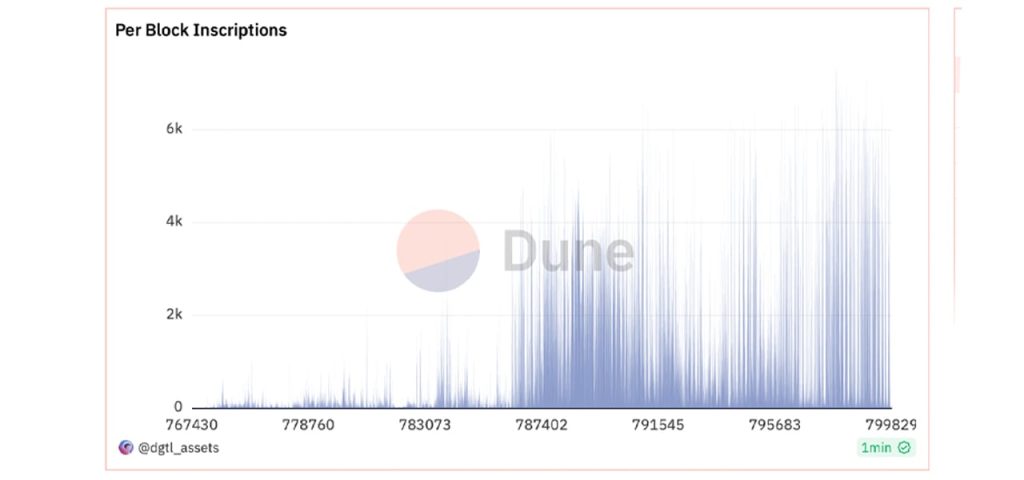 As of July 22, 2023, at block height 799,830, approximately 18,599,837 Ordinal inscriptions have been issued on the bitcoin blockchain. The trend has continued to rise since the first inscription 218 days ago. Archived statistics from Dune Analytics indicate that 78.5% of all the inscriptions minted on Bitcoin are in plain text form or character sets, while another 13.5% is plain text, bringing the total of plain text and character set inscriptions to 92%. The remainder of the inscriptions consist of images, GIF files, animations, applications, and more.