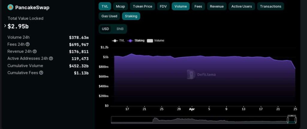 - The total staked value on PancakeSwap fell 17% in the last 24 hours.