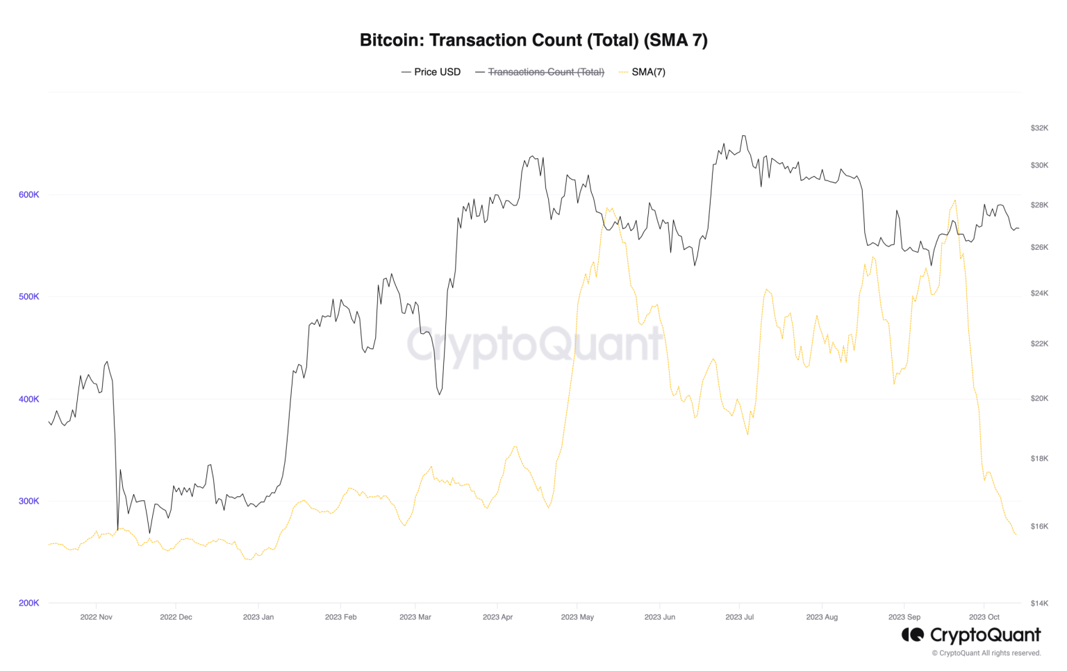 The coin’s transactions count metric, which measures the unique count of transactions executed on the Bitcoin network, assessed on a seven-day small moving average, has fallen to its lowest level since January.