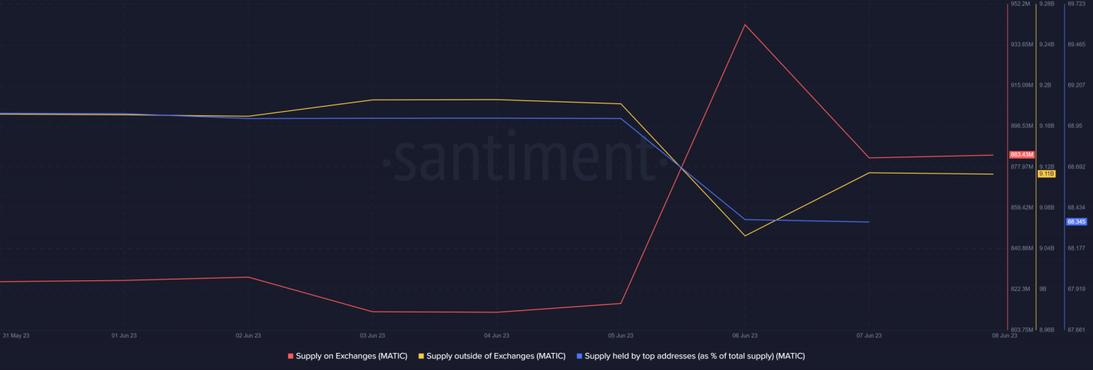 Santiment’s chart suggested that the selling pressure was still on. Polygon’s supply on exchanges increased while its supply outside of exchanges went down. Additionally, the supply held by top addresses also declined, suggesting that investors were selling.