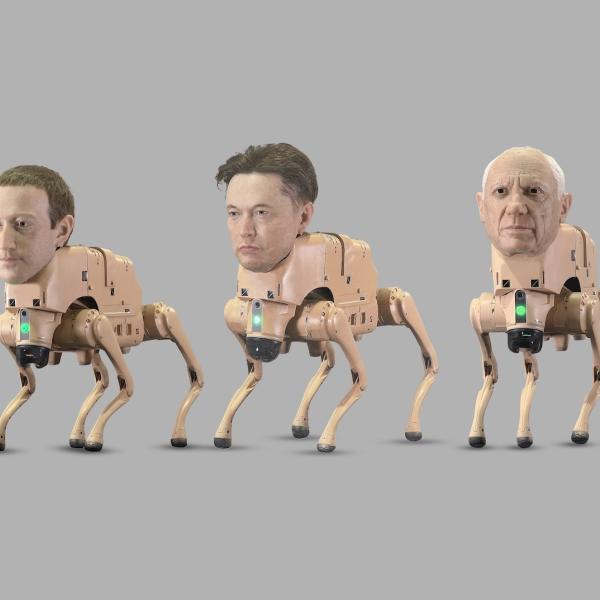 What visitors encountered wasn’t a quiet gallery. They stepped into a fenced pen filled with 10 animatronic “dogs”—flesh-toned, humanoid robots wearing uncannily lifelike masks of tech moguls, art legends, and Beeple himself. These machines walked, watched, captured images of viewers, processed them through AI, and then printed the results from their rear ends as satirical “poop” accompanied by blockchain certification.