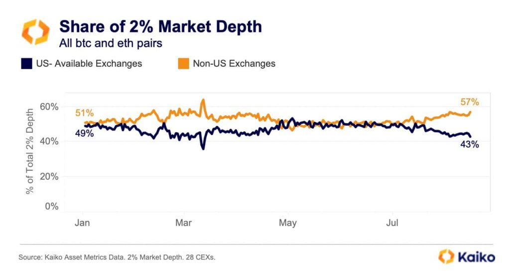 According to a recent report from Kaiko, Bitcoin and Ethereum liquidity in the U.S. witnessed a decline. The data revealed that the portion of liquidity for these assets on U.S.-based exchanges decreased to approximately 43%.
