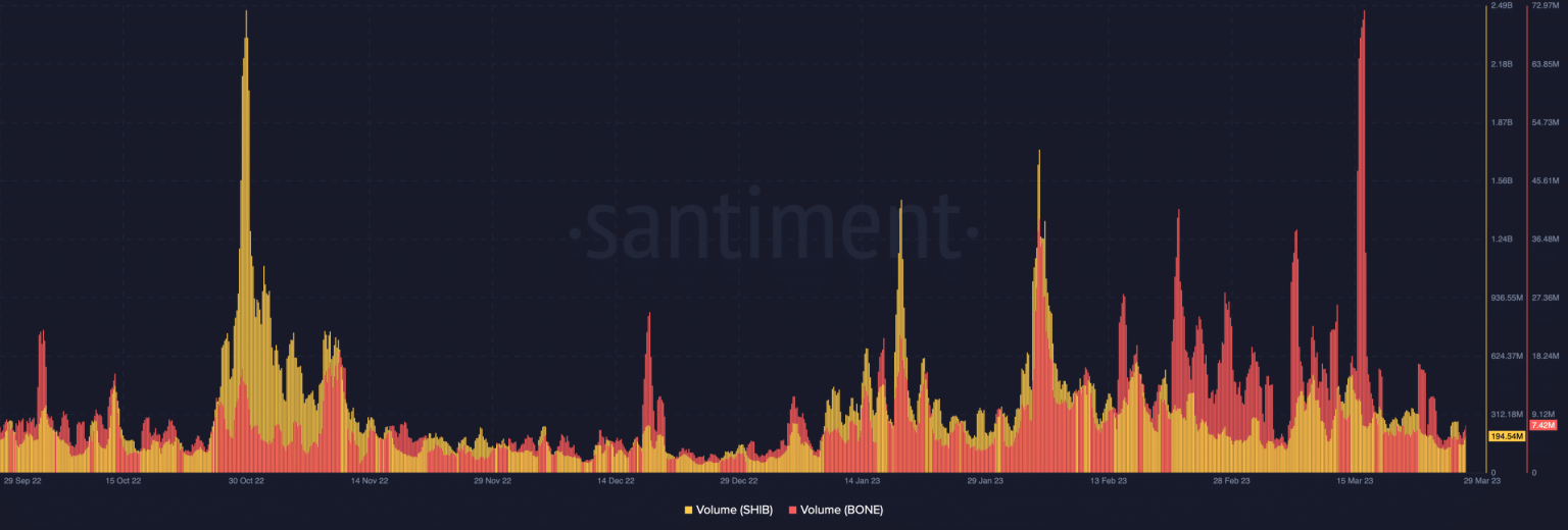 But the volume acts as a reflection of traders jumping on price rises and transaction movements. So, it seemed that SHIB was a visible partaker in the landmark. It was a similar arrangement with BONE whose volume rose to 7.42 million. But as expected, SHIB had the upper hand.