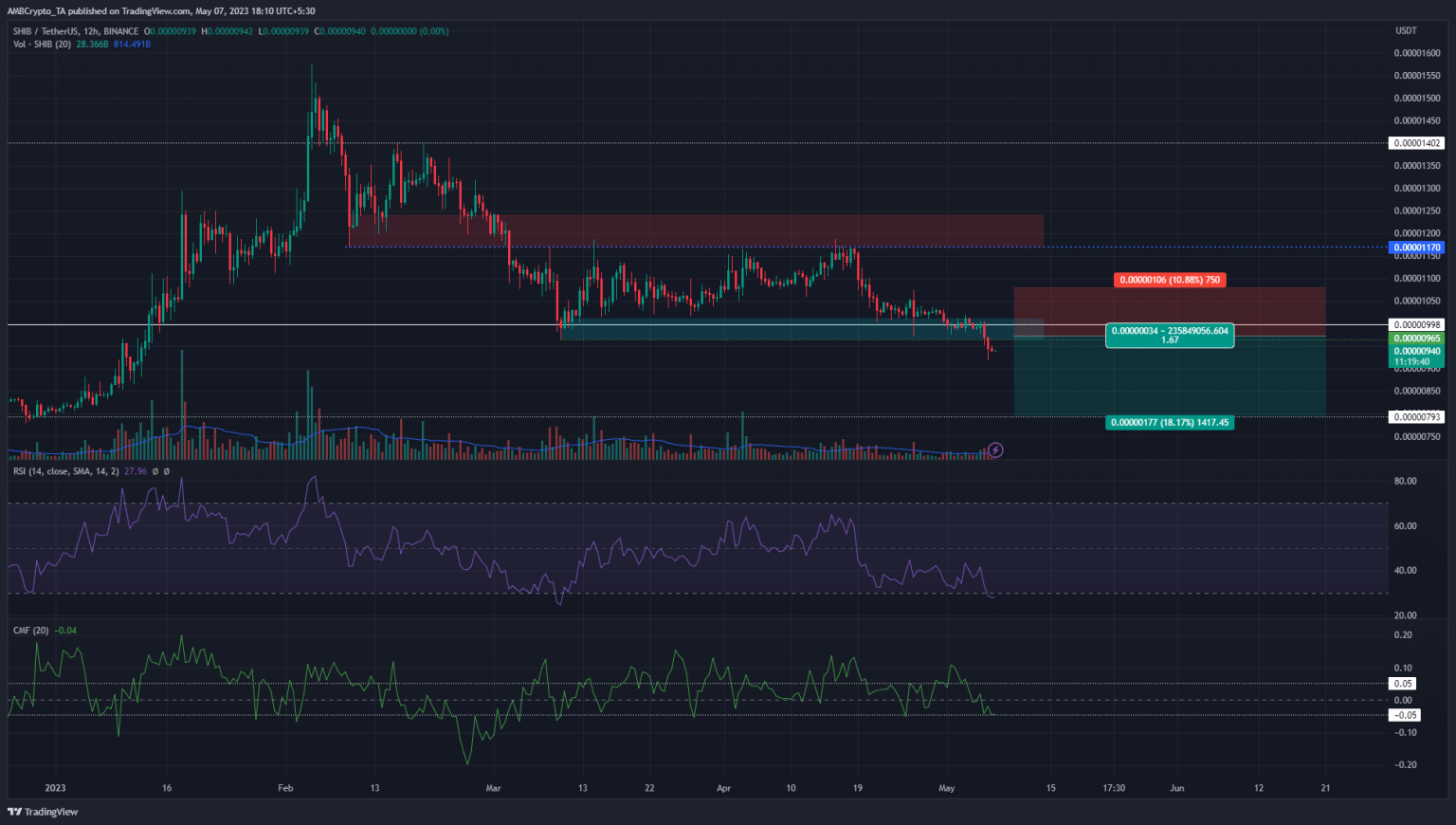 The H4 bullish order block at $0.00001 was highlighted in cyan. It has confluence with a higher timeframe support level at $0.0000998 as well. However, this level was breached in the past 48 hours. Moreover, the March lows at $0.00000965 were lost as well.