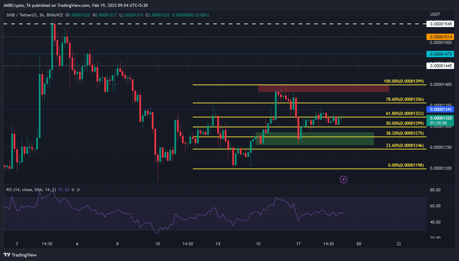 On the other hand, short-sellers could target the 61.8% and 50% Fib levels for shorting opportunities whenever SHIB faces rejection at $0.00001341 and moves southwards.