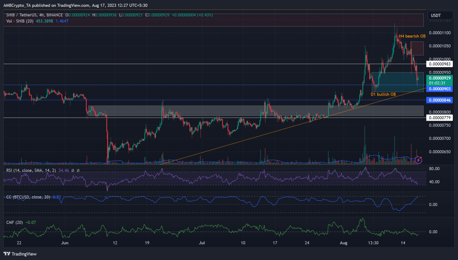 On the zoomed-out H4 chart, the above bullish OB aligned with ascending trendline support and the previous May range-high of $0.00000903. The May range-high had previously stopped the retracement seen between 6-7 August.