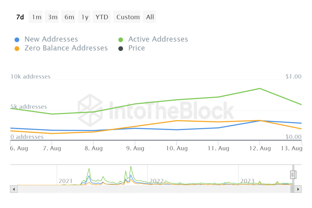 Data provided by Into The Block indicated a recent surge in the activity of Shiba Inu’s addresses over the past seven days, displaying a clear upward trend. The accompanying chart illustrated that the count of active addresses experienced a notable upswing, surpassing 8,000 around 12 August.