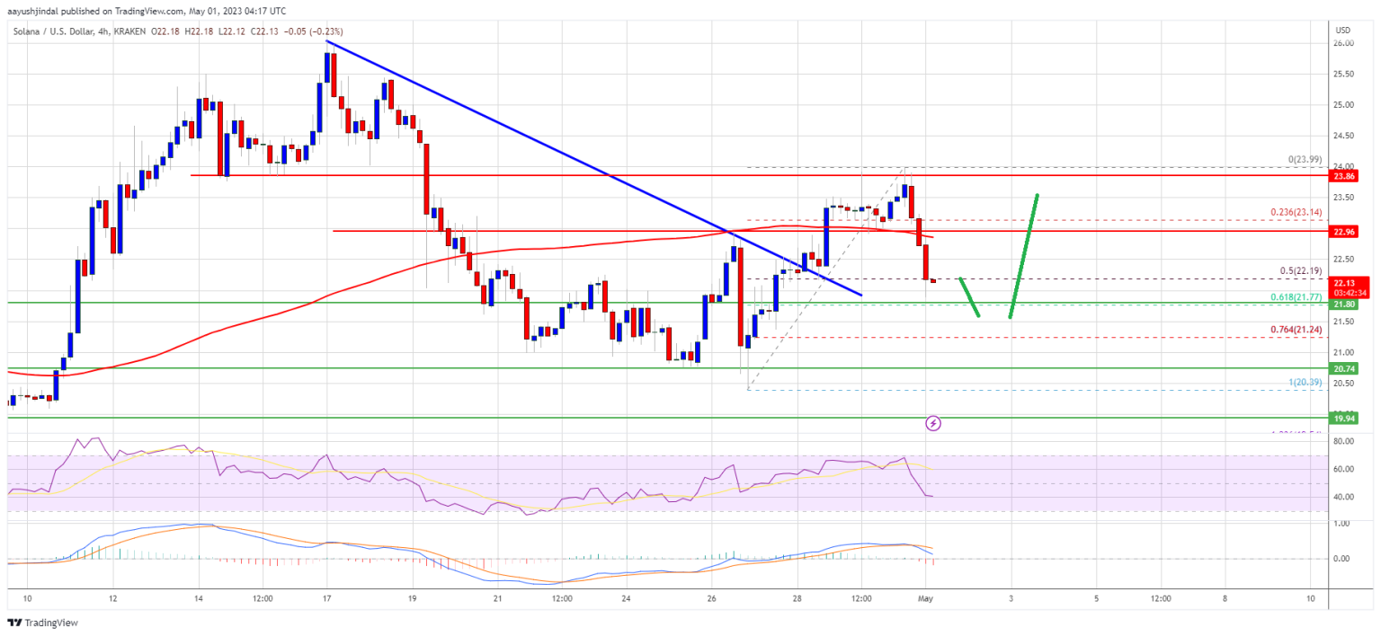 Solana started a downside correction from $24 against the US Dollar. SOL price might start a fresh increase if it stays above the $21.50 support.