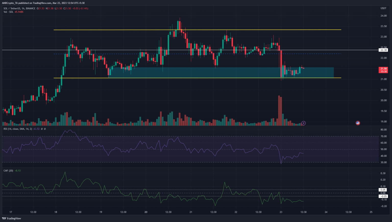 The 1-hour chart showed that Solana has traded within a range between $21.05 and $23.3 over the past five days. A look at higher timeframe charts such as 4-hour showed that the bias was bullish after the recovery from $16.