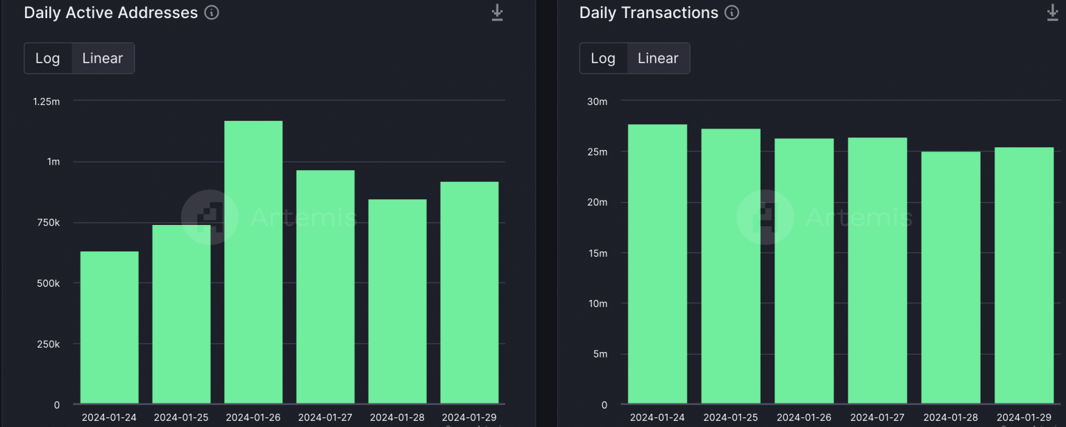 According to Artemis’ data, Solana’s Daily Active Addresses fell from 1.17 million to 920,000 over the last few days. The overall number of transactions occurring on the network also noticed a descent.