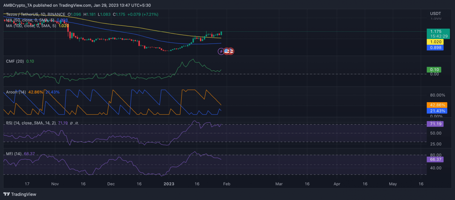 Exchanging hands at $1.17, the altcoin’s price rallied by 4% during that period. In the last week, XTZ’s price also grew by 4%.