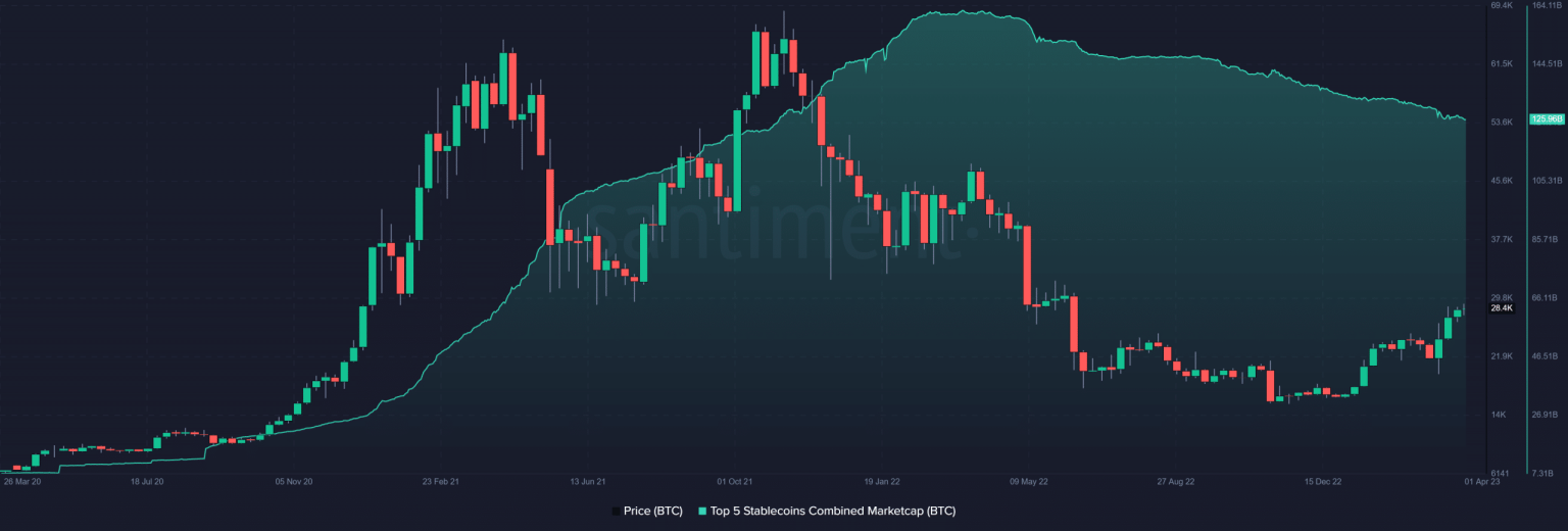 According to data from Santiment, the five largest stablecoins by market capitalization, namely Tether [USDT], USD Coin [USDC], Binance USD [BUSD], DAI, and Pax Dollar [USDP], have experienced a fall in their purchasing power over recent months. As of writing, the combined purchasing power of these stablecoins was about $125.9 billion, with a noticeable downward trend evident in the chart.