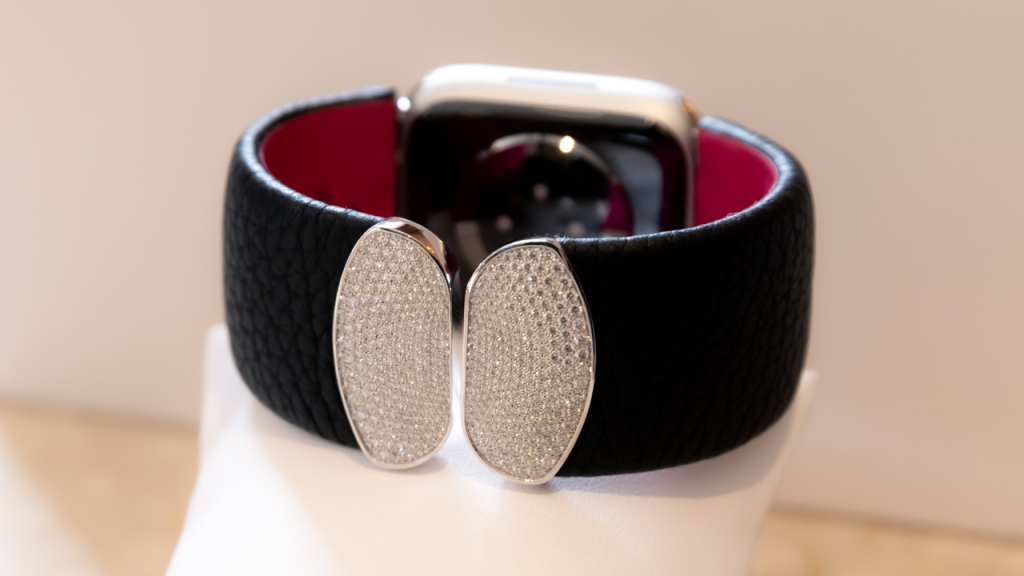That rendition features over 400 VVS diamonds totaling 2.5 carats, set in white gold palladium and requiring some 136 hours of hand workmanship. The cuffs are designed so that Apple’s smartwatch can be worn under the wrist, so your messages don’t flash up for all to see.
