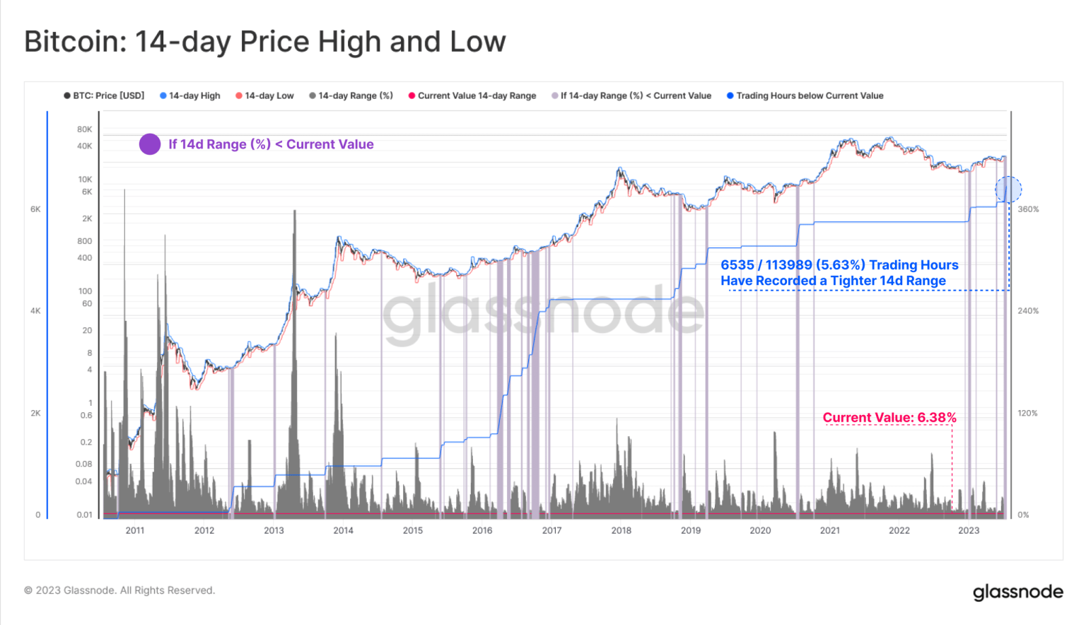 However, this extended lull in trading activity could soon give way to a period of volatility. As per on-chain analytics firm Glassnode, BTC’s 14-day price range increased to 6.38% over the past week.