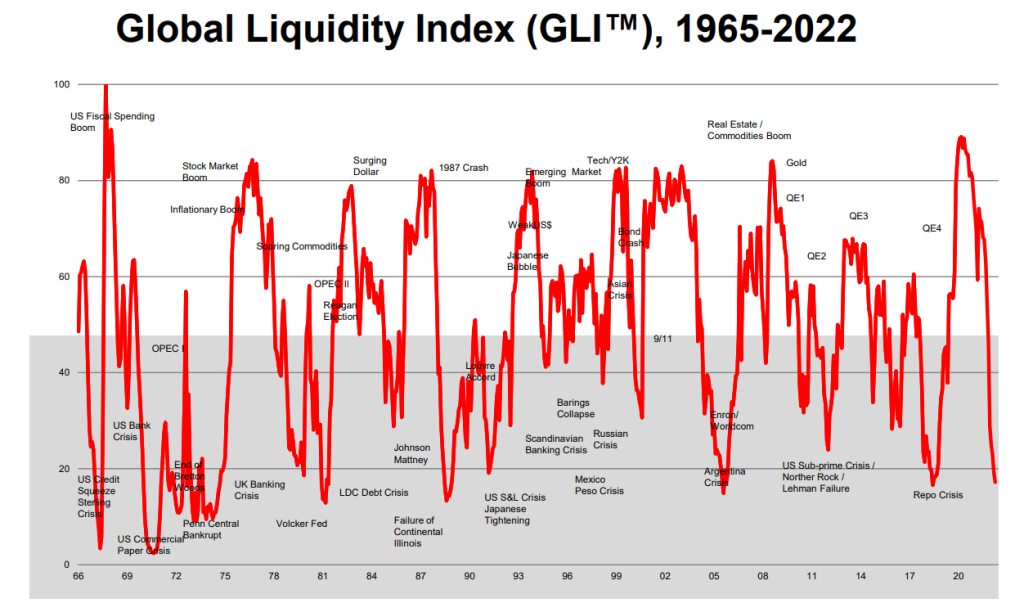 The Global Liquidity Index (GLI) chart ranges from 0-100 and captures the Global Liquidity Cycle as a normalized index.