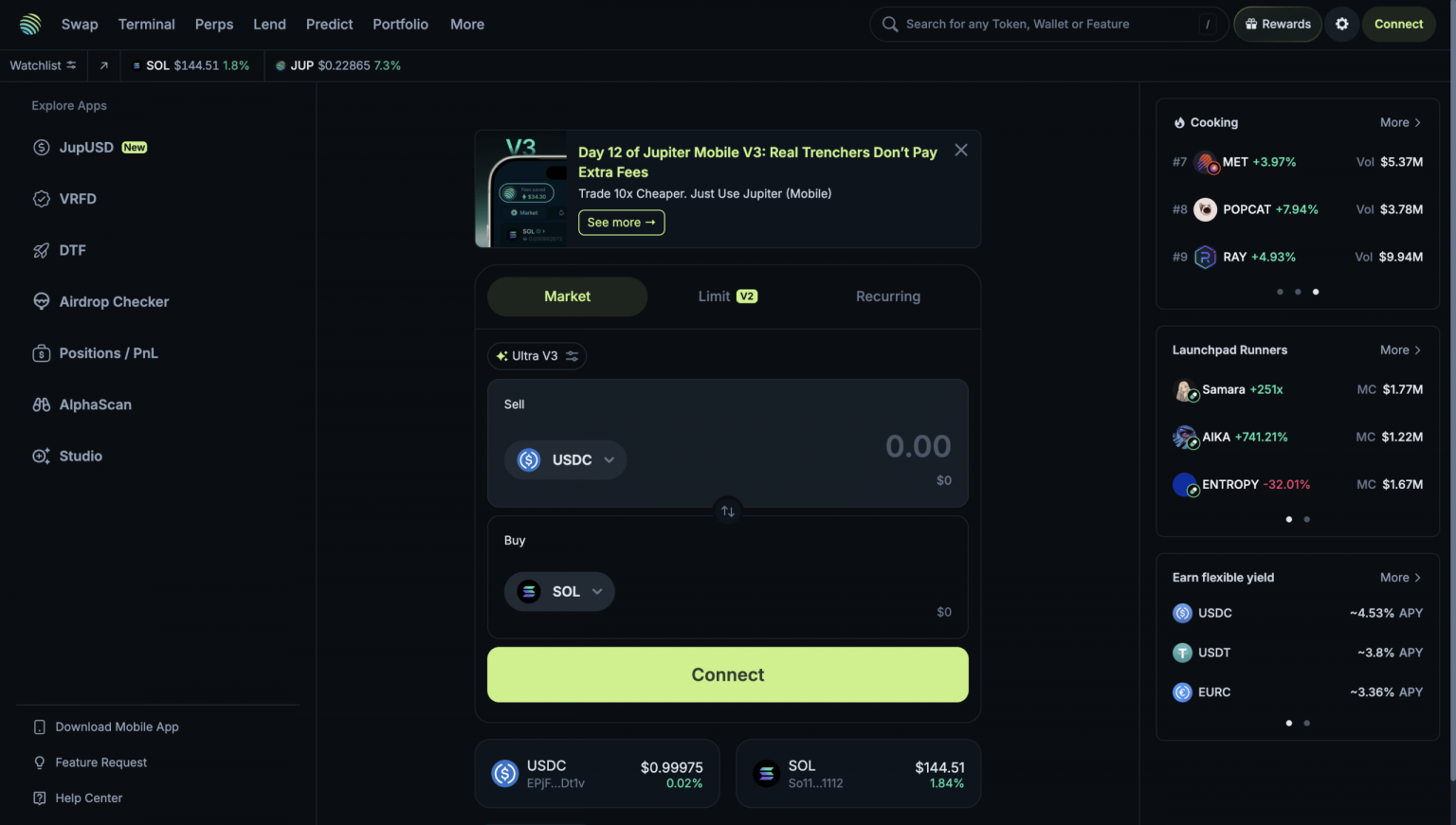 Jupiter is a leading Solana aggregator that gathers information across multiple decentralized exchanges in one place. Jupiter users get access to the most profitable trading prices and instead of having to check different platforms, they can swap tokens with low fees and minimal slippage in a single interface. Beyond simple swaps, Jupiter also offers advanced tools like limit orders, dollar-cost averaging, perpetual futures, and lending, making it a full-featured DeFi hub. Its native token, JUP, is used for governance, letting the community vote on upgrades and treasury decisions. Jupiter is interesting for users and investors alike, because it combines fast Solana performance with deep liquidity, active community participation, and a growing range of financial tools.
