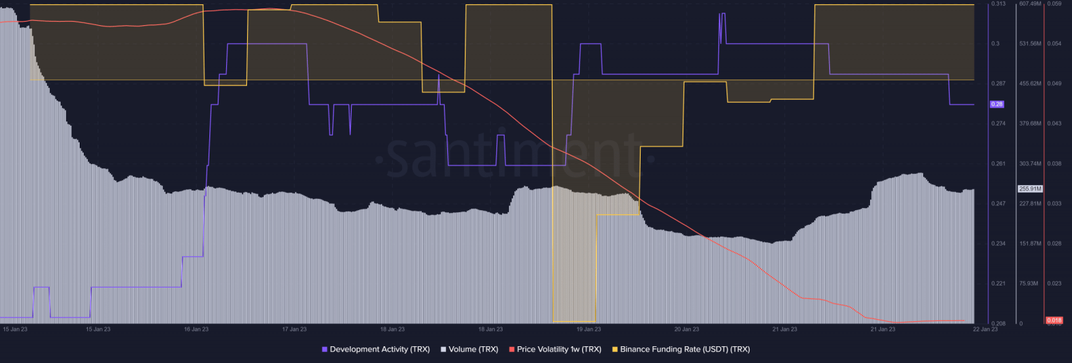 Moreover, LunarCrush’s data revealed that TRX’s market dominance also declined by 20% during the last seven days. However, the development activity increased, reflecting the increased efforts of developers. TRX also managed to gain interest from the derivatives market as its Binance funding rate registered an uptick.