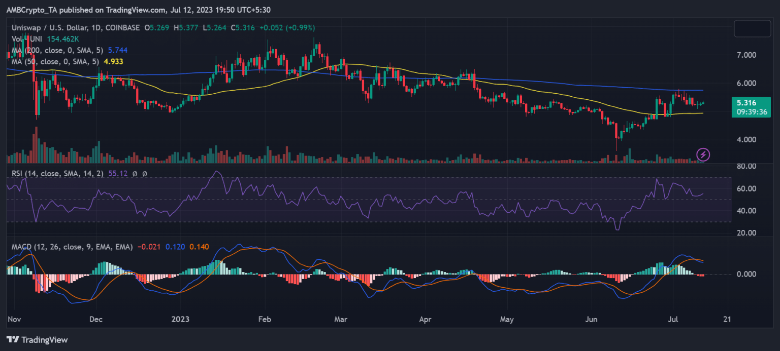 The daily timeframe chart of Uniswap [UNI] showed that it had experienced modest upward movements. As of this writing, UNI was trading around $5.2, with a marginal profit of less than 1%. The Relative Strength Index (RSI) indicated a bullish trend, albeit weak, while the Moving Average Convergence Divergence (MACD) suggested a similar sentiment.