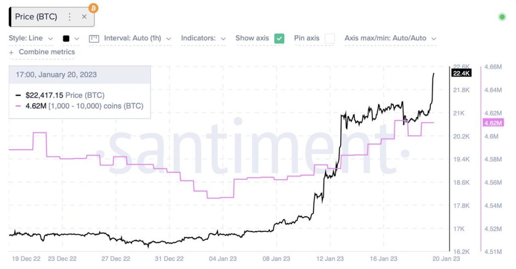 In the last few days, however, the 1,000-10,000 BTC wallet group has again done some buying as their Supply Distribution curve has once more spiked up. Following this latest accumulation, BTC has again caught a sharp uptrend as the price of the coin has now surged to almost $23,000.