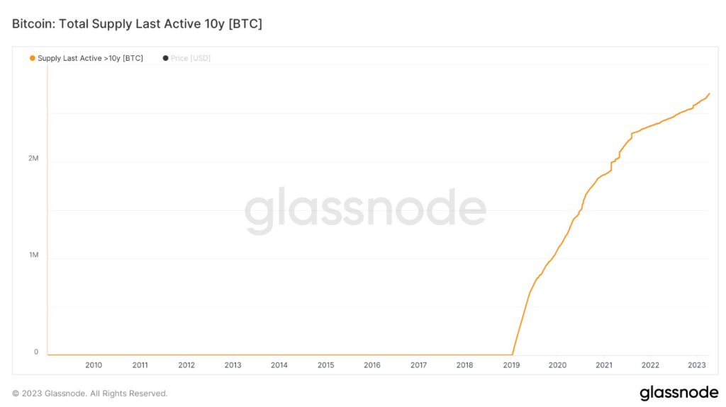Total supply of Bitcoin last active more than 10 years ago. Source: Glassnode