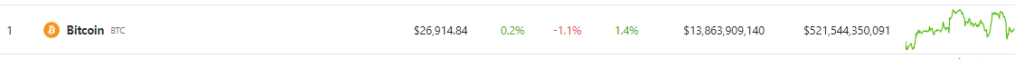 Bitcoin’s price, as reported by CoinGecko, currently stands at $26,914, reflecting a slight 1.1% decline over the past 24 hours, while the cryptocurrency was up 1.4% over the last seven days.