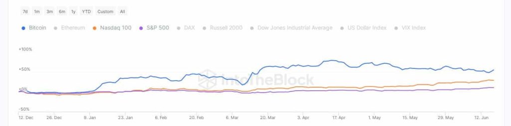 But this has started to change. The spate of banking collapses in March led investors to put their funds in the crypto market. Following this, the world’s largest crypto by market cap, Bitcoin soared 52% until hitting its yearly peak in April, as per IntoTheBlock. On the other hand, equity indices were largely flat until that point.