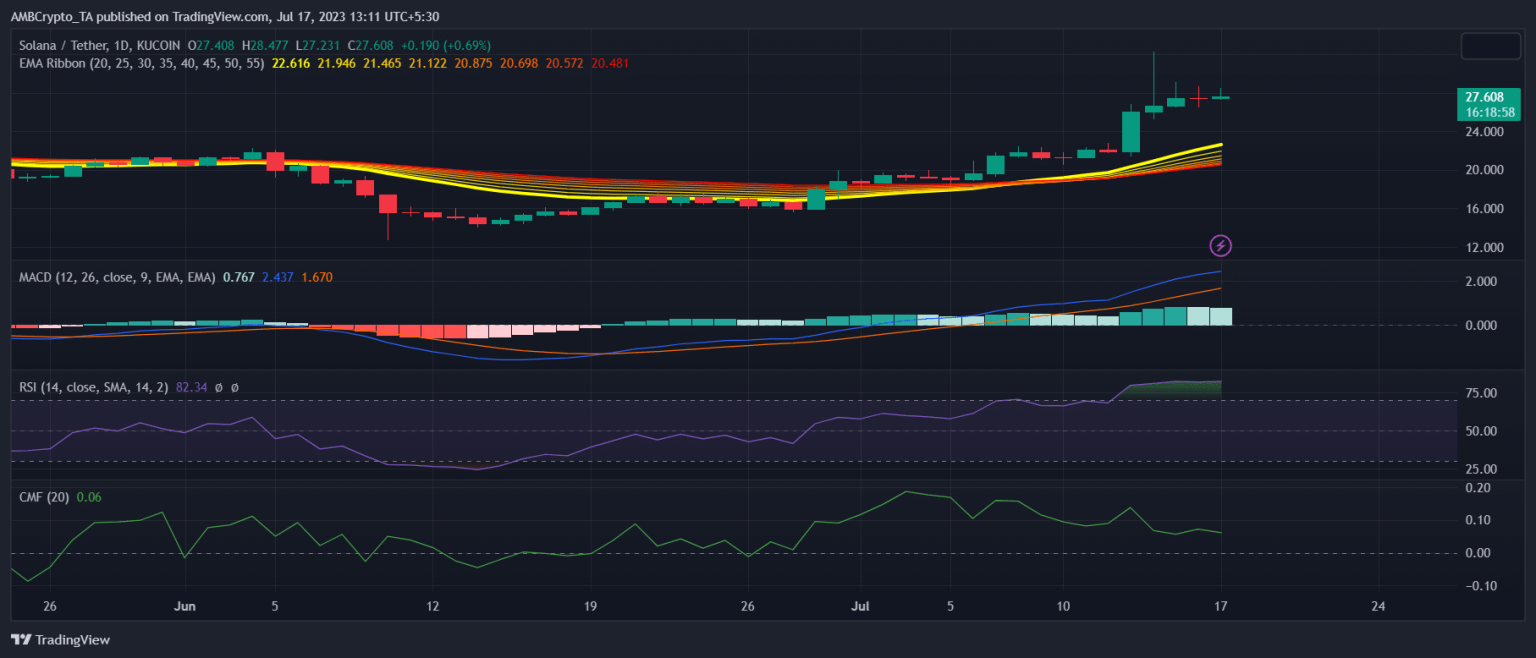 In the last bull run, Solana’s price registered an increase of more than 30% in the last seven days. While SOL’s price went up by 30%, ADA, on the other hand, was able to lift its price by more than 12% in the last week. Thanks to this, SOL’s market increased and was also able to overtake ADA to become the 7th largest crypto. At the time of writing, SOL was trading at $27.81 with a market cap of over $11.19 billion. A look at Solana’s daily chart revealed quite a few market indicators that helped the token increase its value.