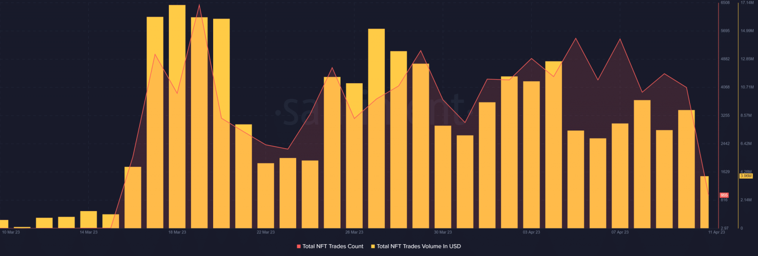 Santiment’s chart revealed that in the last month, Hedera witnessed a massive surge in the total number of NFT trade counts and trade volume in USD.