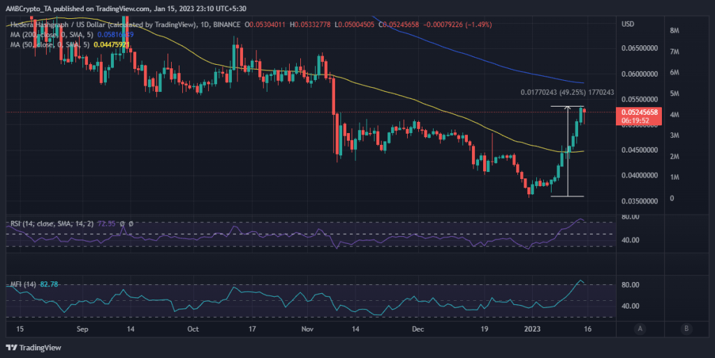 HBAR has seen a surge in demand as well as price in the first two weeks of January after previously crashing hard in 2022. The cryptocurrency just concluded a 49% upside in the last two weeks.