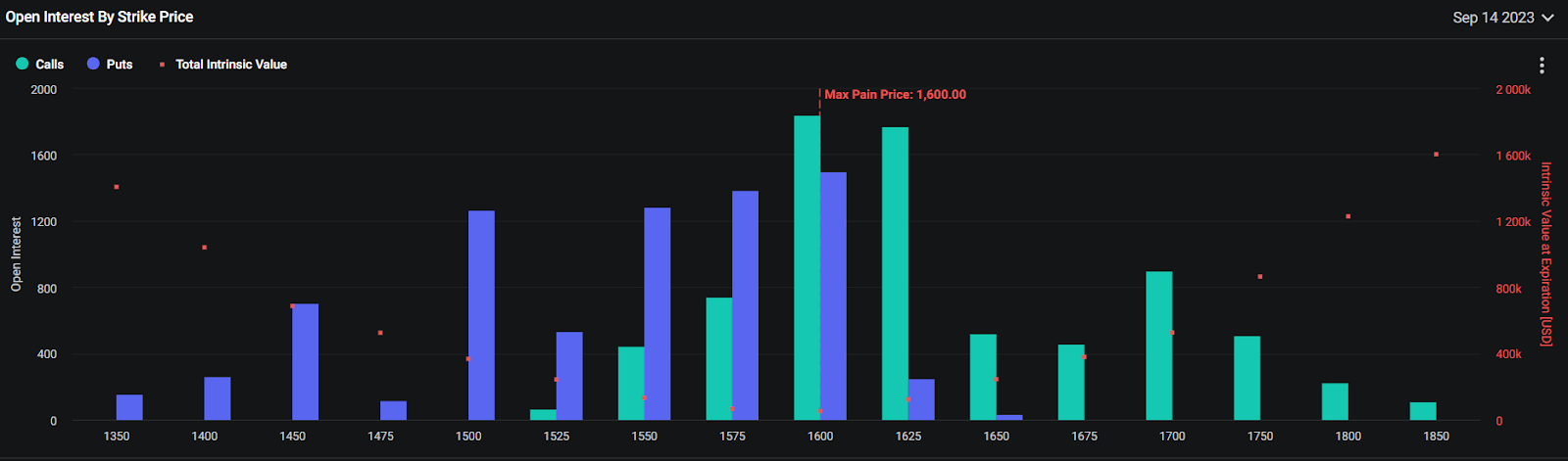 According to options data, there’s been a notable uptick in call options in the $1,600-$1,625 price range. Yet, with a put/call ratio of 0.99, it appears that bearish traders are also hedging for a potential drop to $1,500. The total open interest stands at 15,130, with a notional value of $24.3 million.