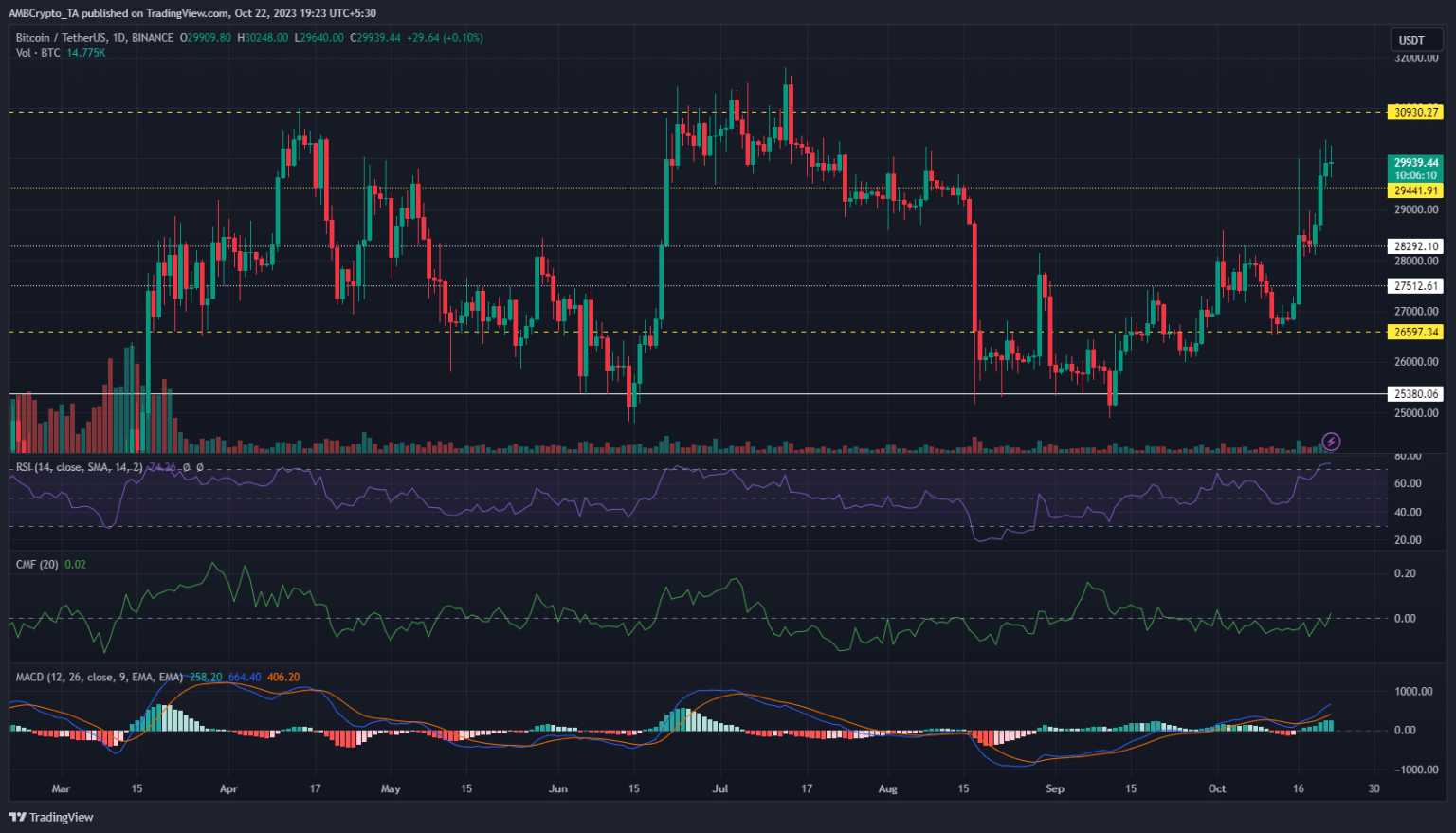 Bitcoin’s [BTC] remarkable week-long pump extended past the $29.4k resistance level, as bulls ramped up the buying pressure. The bullish rally began on 15 October and as of press time, BTC registered 11.4% gains, rising from $26.8k to $29.9k.