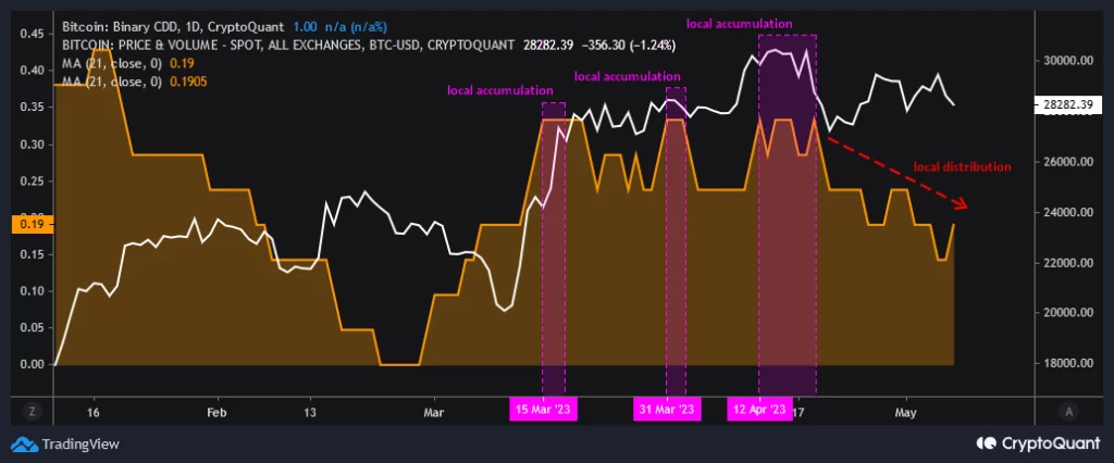 According to Baro, BTC’s CDD metric revealed that the king coin enjoyed three periods of local accumulation on 15 March, 31 March, and 12 April, respectively, after which a period of local distribution began on 20 April.