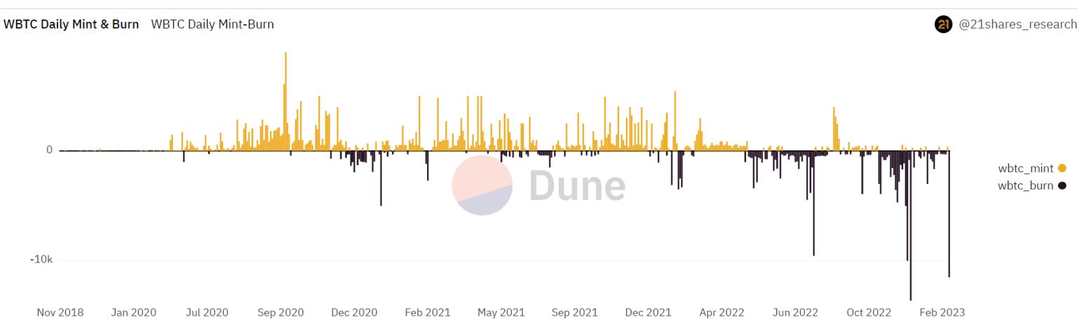 The supply of wrapped Bitcoin (wBTC) dropped to its lowest since May 2021 after the second-largest single-day burn on Feb. 27.