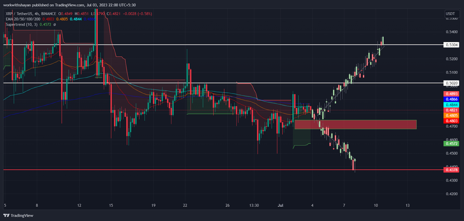 The 20-day EMA remains a crucial barrier that bullish traders need to surpass. If buyers manage to break through the $0.5 mark, it could set the stage for a surge toward the key resistance level of $0.53.
